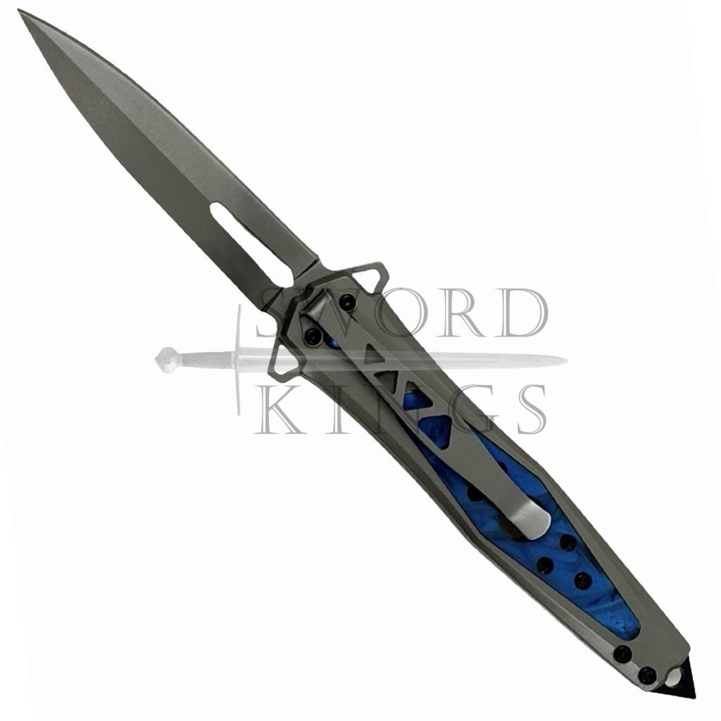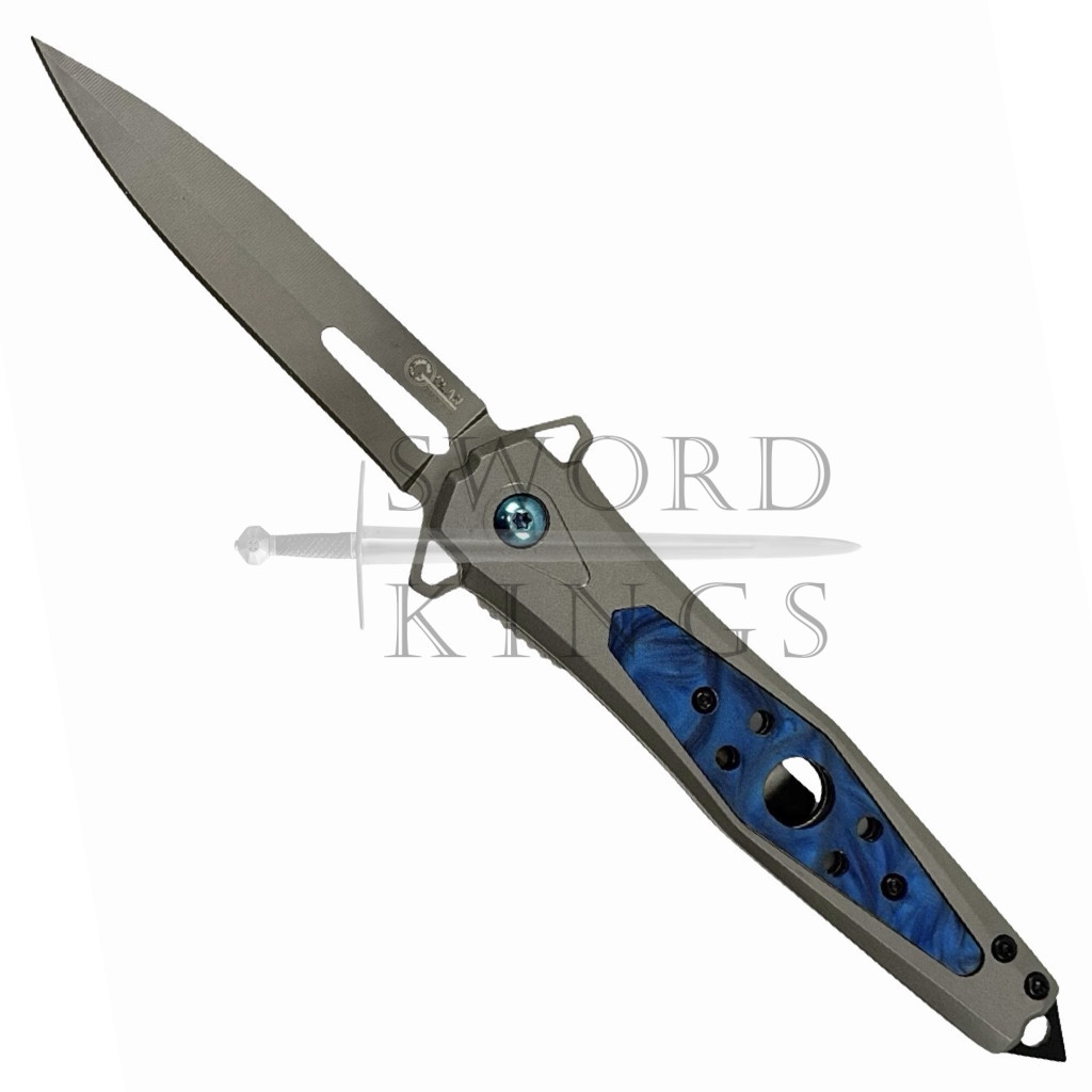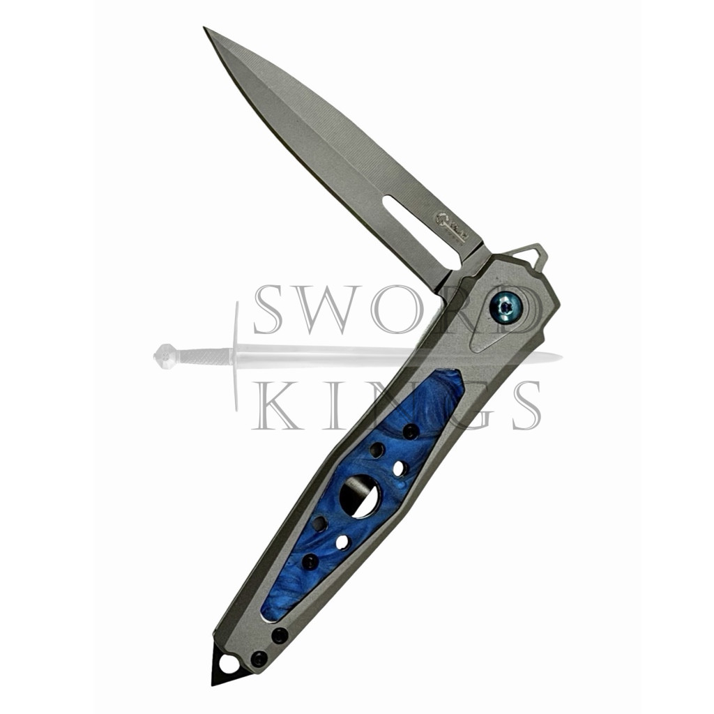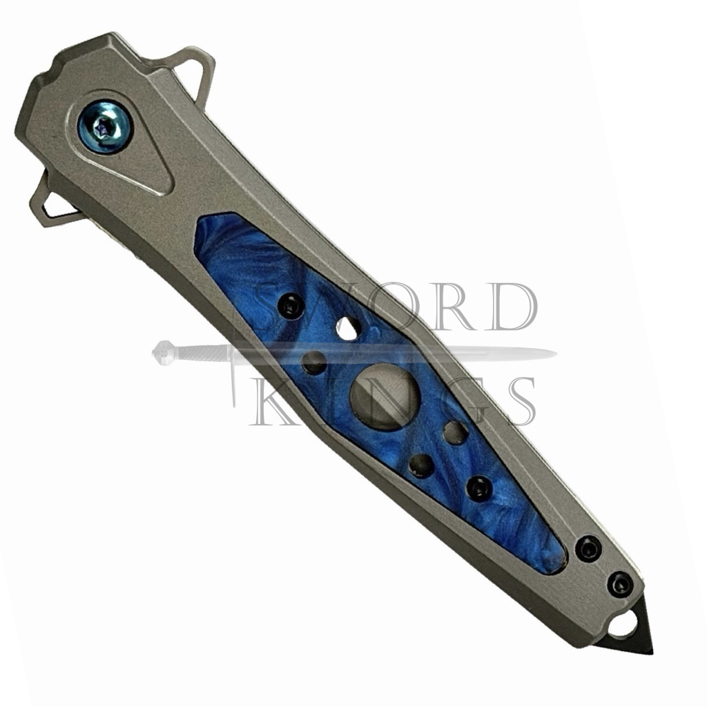 Grey Folding Penknife With Multi Blue In Lay Handle With Lanyard Hole and Belt Clip