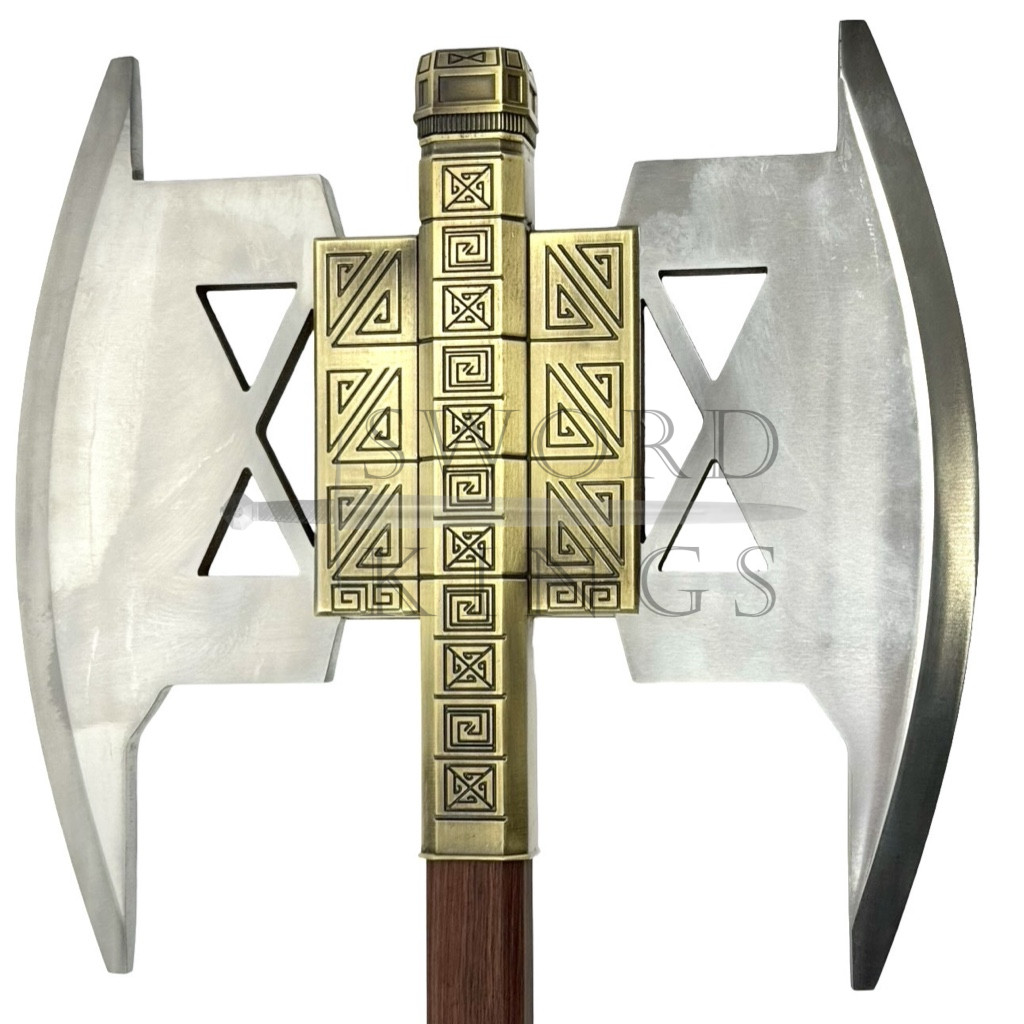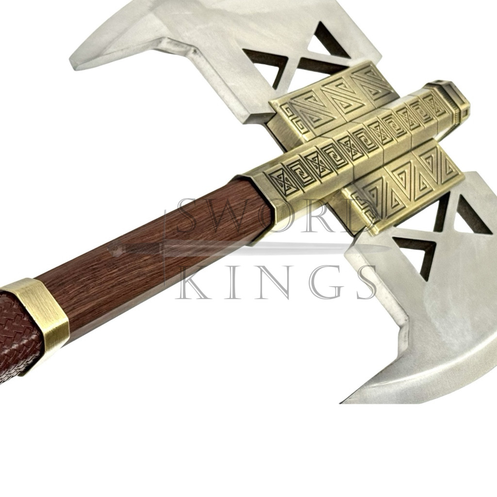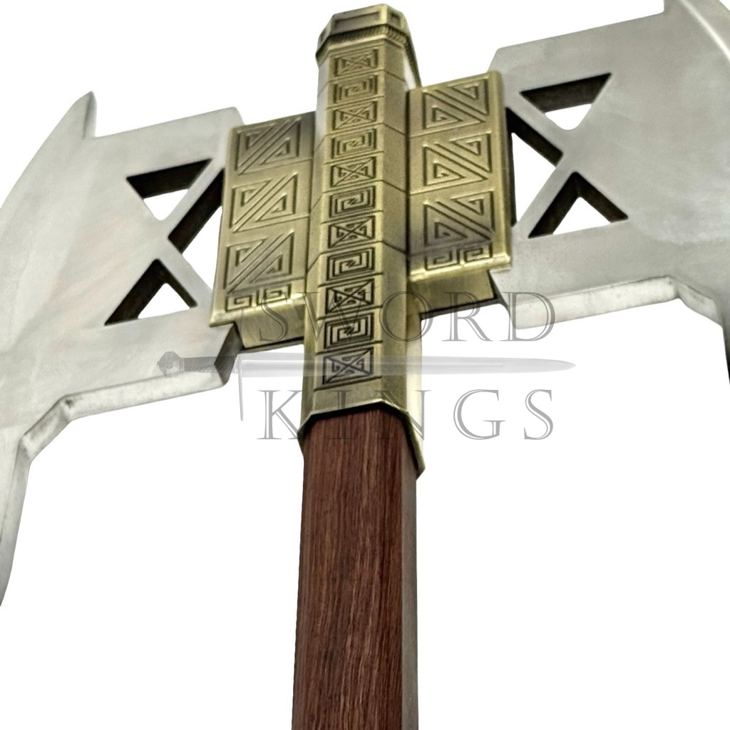 A Dwarfs unique and remarkable double-headed axe recreated in exquisite detail. It is made of wood, leather, and metal and comes with a wall mount for easy display. Measures approximately 34 inches in length.