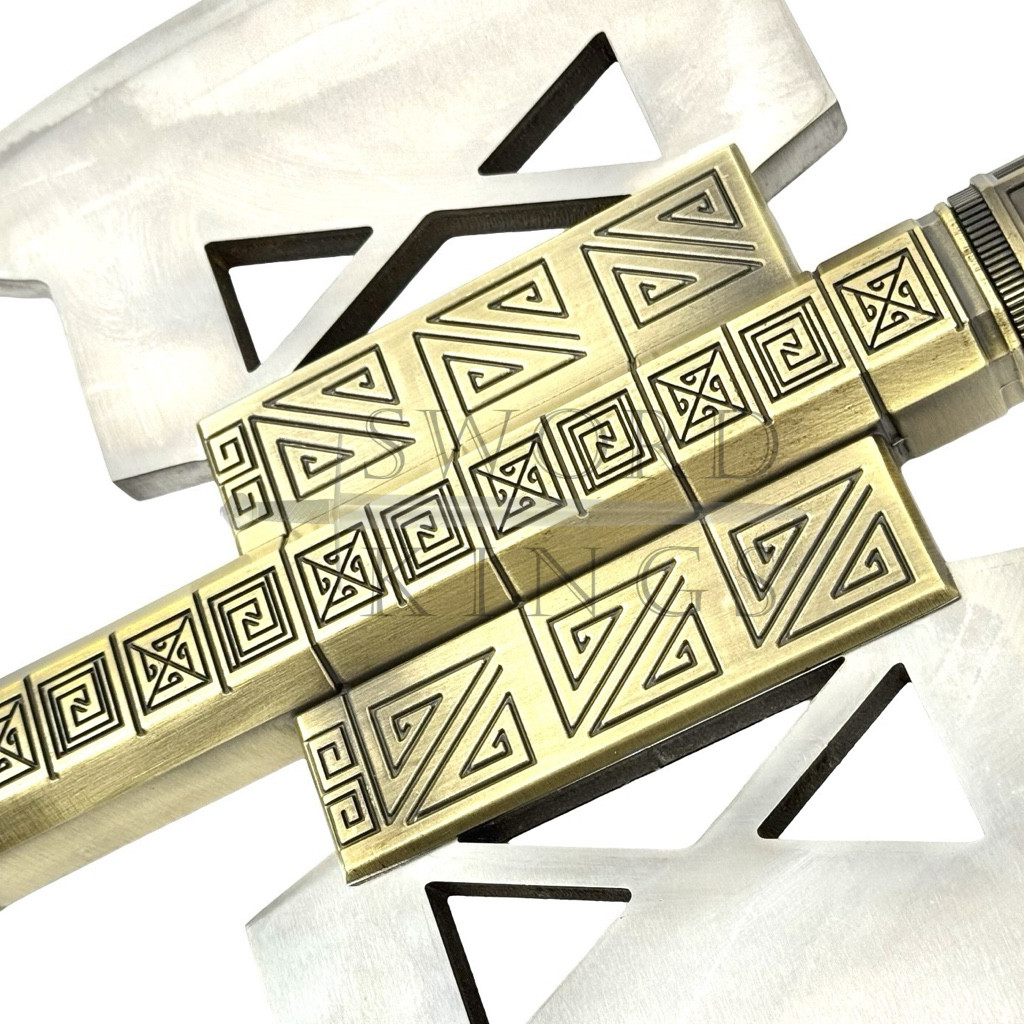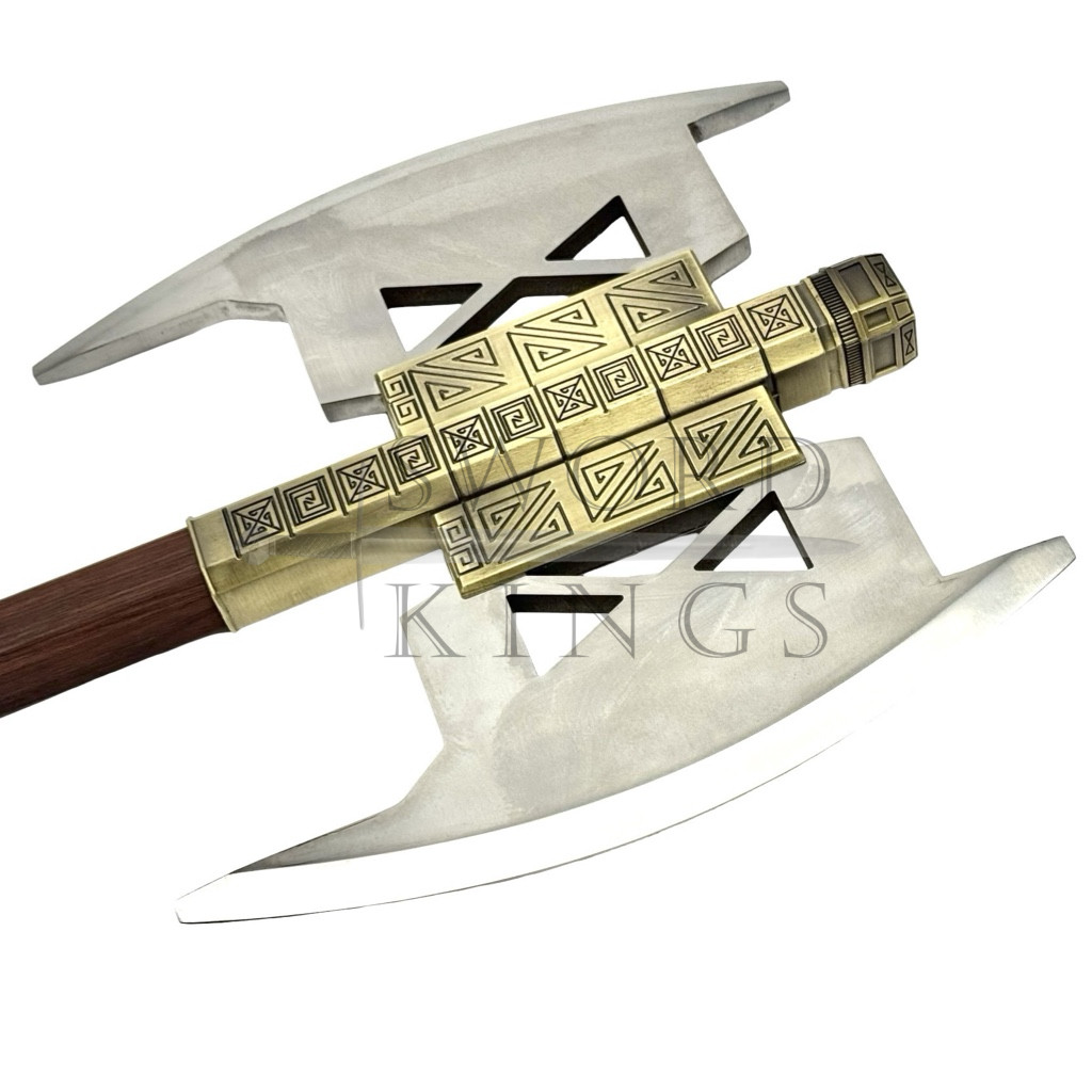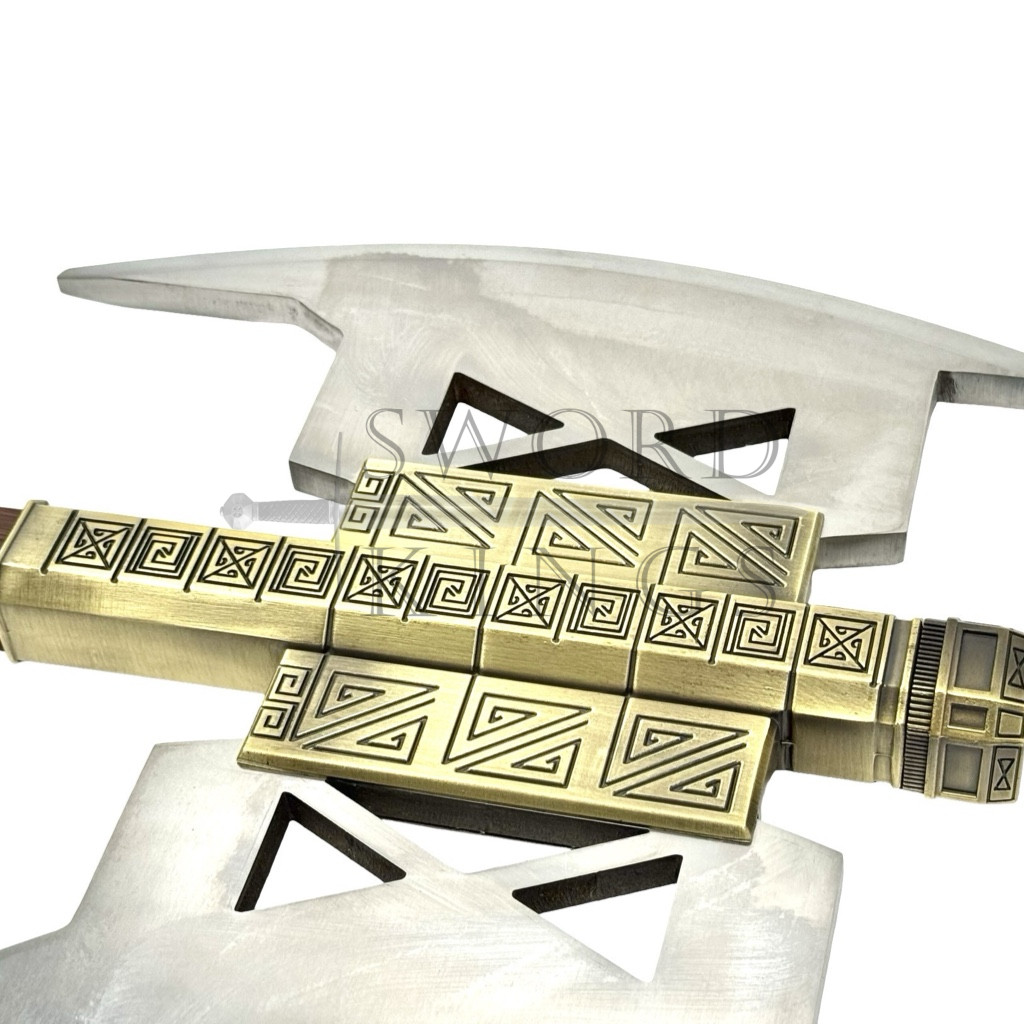 A Dwarfs unique and remarkable double-headed axe recreated in exquisite detail. It is made of wood, leather, and metal and comes with a wall mount for easy display. Measures approximately 34 inches in length.